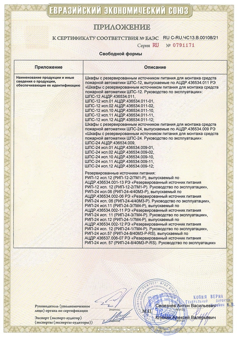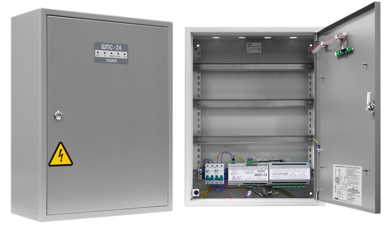 Шкаф пожарной сигнализации. Шкаф для монтажа средств пожарной автоматики с креплением на DIN-рейку; 2 ввода питания; U-вх.150…253 В, U-вых.27.2±6 В, I-ном.2 А, I-макс.2.2 А, под два АКБ 12 В 17 А·ч; встроенный блок коммутации БК-24-RS485 (две изолированные линии интерфейса RS-485 для подключения к компонентам ППКП и ППКУП расположенным за пределами ШПС, одна линия RS-485 для подключения компонентов ППКП внутри ШПС; 7 выходов для подключения к приборам внутреннего интерфейса RS-485; 7 выходных каналов 24 В с индивидуальной защитой); IP41, t-раб.-10…+40°С, 650х500х220 мм. Возможность установки монтажного комплекта МК-1.