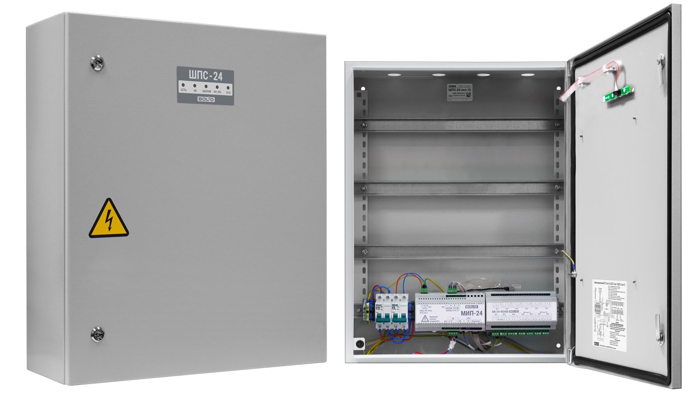 Шкаф пожарной сигнализации. Шкаф для монтажа средств пожарной автоматики с креплением на DIN-рейку; 2 ввода питания; U-вх.150…253 В, U-вых.27.2±6 В, I-ном.2 А, I-макс.2.2 А, под два АКБ 12 В 17 А·ч; встроенный блок коммутации БК-24-RS485 (две изолированные линии интерфейса RS-485 для подключения к компонентам ППКП и ППКУП расположенным за пределами ШПС, одна линия RS-485 для подключения компонентов ППКП внутри ШПС; 7 выходов для подключения к приборам внутреннего интерфейса RS-485; 7 выходных каналов 24 В с индивидуальной защитой); IP54, t-раб.-10…+40°С, 650х500х220 мм. Возможность установки монтажного комплекта МК-1.