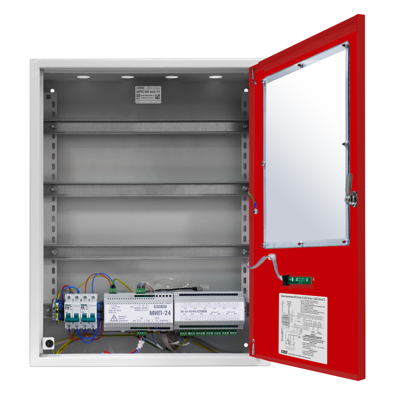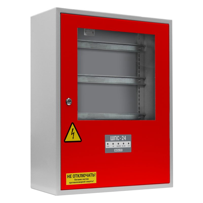 Шкаф пожарной сигнализации. Шкаф для монтажа средств пожарной автоматики с креплением на DIN-рейку; 2 ввода питания; U-вх.180…265 В, U-вых.27.2±6 В, I-ном.3 А, I-макс.3.5 А, под два АКБ 12 В 26/40 А·ч; встроенный блок коммутации БК-24-RS485 (две изолированные линии интерфейса RS-485 для подключения к компонентам ППКП и ППКУП расположенным за пределами ШПС, одна линия RS-485 для подключения компонентов ППКП внутри ШПС; 7 выходов для подключения к приборам внутреннего интерфейса RS-485 и 7 выходов питания; IP41, t-раб.-10…+40°C, 700х600х225 мм. Дверь красного цвета. Дверь с прозрачным стеклом.