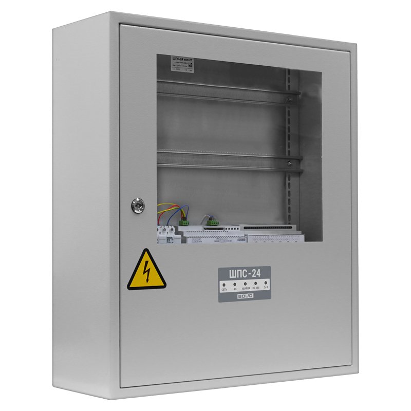 Шкаф пожарной сигнализации. Шкаф для монтажа средств пожарной автоматики с креплением на DIN-рейку; 2 ввода питания; U-вх.180…265 В, U-вых.27.2±6 В, I-ном.3 А, I-макс.3.5 А, под два АКБ 12 В 26/40 А·ч; встроенный блок коммутации БК-24-RS485 (две изолированные линии интерфейса RS-485 для подключения к компонентам ППКП и ППКУП расположенным за пределами ШПС, одна линия RS-485 для подключения компонентов ППКП внутри ШПС; 7 выходов для подключения к приборам внутреннего интерфейса RS-485 и 7 выходов питания; IP41, t-раб.-10…+40°С, 700×600×225 мм. Дверь с прозрачным стеклом.