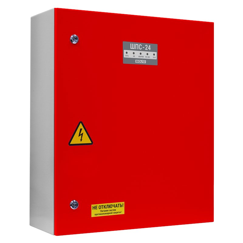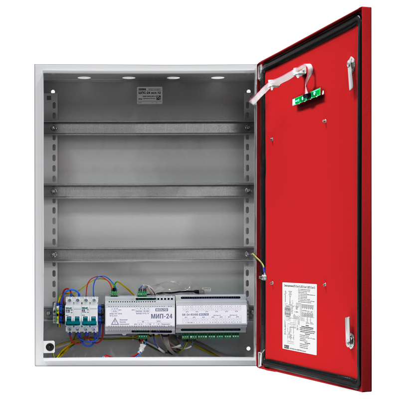 Шкаф пожарной сигнализации. Шкаф для монтажа средств пожарной автоматики с креплением на DIN-рейку; 2 ввода питания; U-вх.180…265 В, U-вых.27.2±6 В, I-ном.3 А, I-макс.3.5 А, под два АКБ 12 В 26/40 А·ч; встроенный блок коммутации БК-24-RS485 (две изолированные линии интерфейса RS-485 для подключения к компонентам ППКП и ППКУП расположенным за пределами ШПС, одна линия RS-485 для подключения компонентов ППКП внутри ШПС; 7 выходов для подключения к приборам внутреннего интерфейса RS-485 и 7 выходов питания; IP54, t-раб.-10…+40°C, 700х600х225 мм. Дверь красного цвета. Возможность установки монтажного комплекта МК-1.