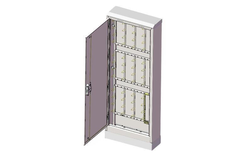 Предназначен для перехода с магистральных кабелей на распределительные кабели местных сетей. Номинальная емкость шкафа – 2400 пар.Шкафы ШР могут устанавливаться как внутри помещений, так и на открытом воздухе. Использование покрытий, обладающих высокой механической прочностью, коррозийной и химической стойкостью, позволяют применять шкафы в неблагоприятных климатических условиях. Высокая прочность материала и уплотнители дверей предотвращают попадание внутрь шкафа пыли, влаги и насекомых. Надежный замок с приводом на тяге обеспечивает блокировку двери в трех точках. Крепление монтажной рамы непосредственно к цоколю (основанию) позволяет заменить корпус шкафа без демонтажа боксов БКТ.Вместо боксов БКТ в шкафы могут быть установлены боксы БКТО, при этом номинальная емкость шкафов увеличивается в 2 раза (с 1200 до 2400 пар).Поставляется пустым в виде корпуса.