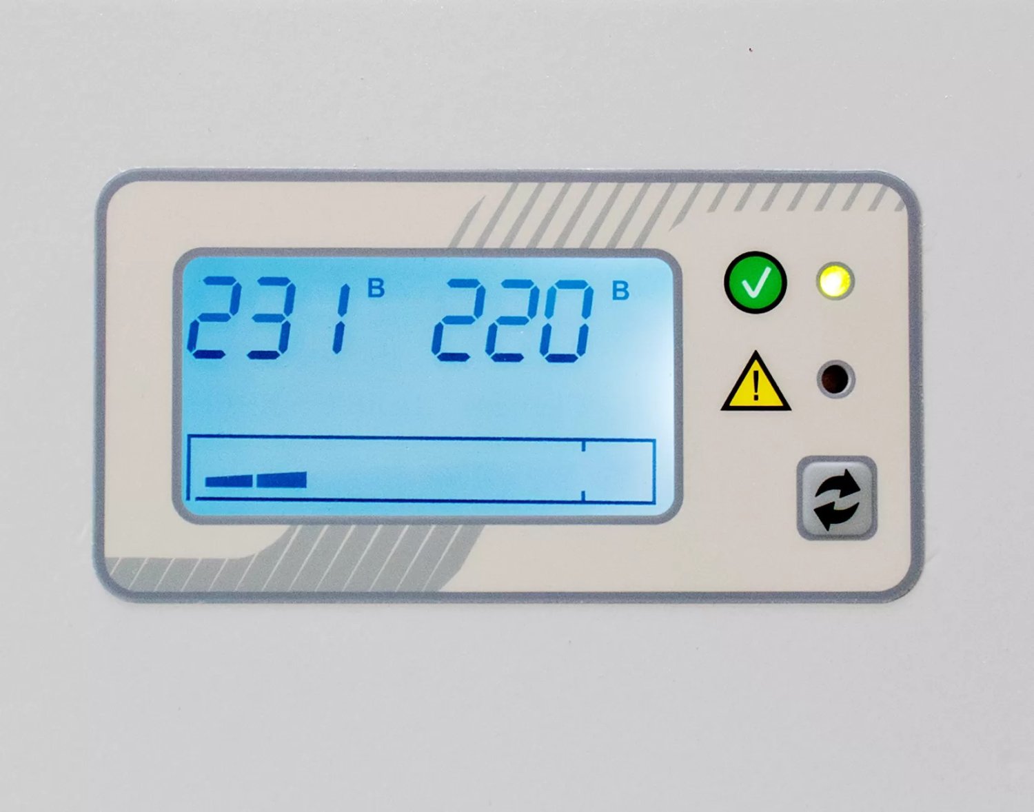 Стабилизатор переменного напряжения инверторный. Стабилизатор переменного напряжения инверторный (с двойным преобразованием) однофазный, чистая синусоида; P-нагр.10 кВА/9 кВт, U-вх.165…310 В, U-вых.220…230 В (с шагом 1 В), I-вых.45 A; IP20, t-раб. +5…+40°C, 498х370х101 мм