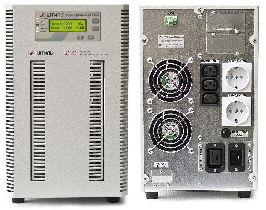 Источник бесперебойного питания. Источник бесперебойного питания напольный, on-line (с двойным преобразованием), чистая синусоида, 3000 ВA (2700 Вт); U-вх.220 В; встроенные аккумуляторы, 8х12В/9Ач, U-акб.96 В, I-заряд.1 А; ЖК-дисплей; выходные разъёмы - IEC-320-C13 (3 шт.), EURO F-type с заземлением (2 шт.), IEC-320-C19 (1 шт.); холодный старт, совместим с генератором; IP20, t-раб.+5...+40°C, 346х210х443 мм