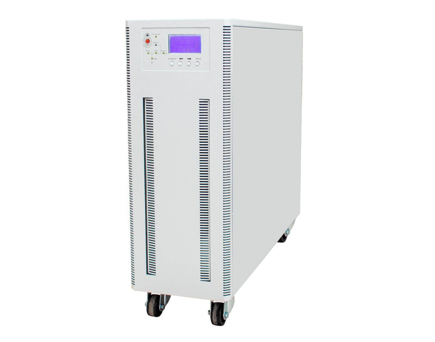 Источник бесперебойного питания. Источник бесперебойного питания on-line; LCD дисплей; чистая синусоида; U-вх. 228-478 В; нагрузка 15000 ВА/13500 Вт; вход/выход клеммные колодки; встроенные 40 АКБ 12 В, 9Ач ; защита от КЗ и перегрузки; RS-232, RS-485, EPO, USB, слот для SNMP карты; время работы в автономном режиме при 100% нагрузке - 7 мин; IP20; 0…+40°C; 715х250х865 мм.