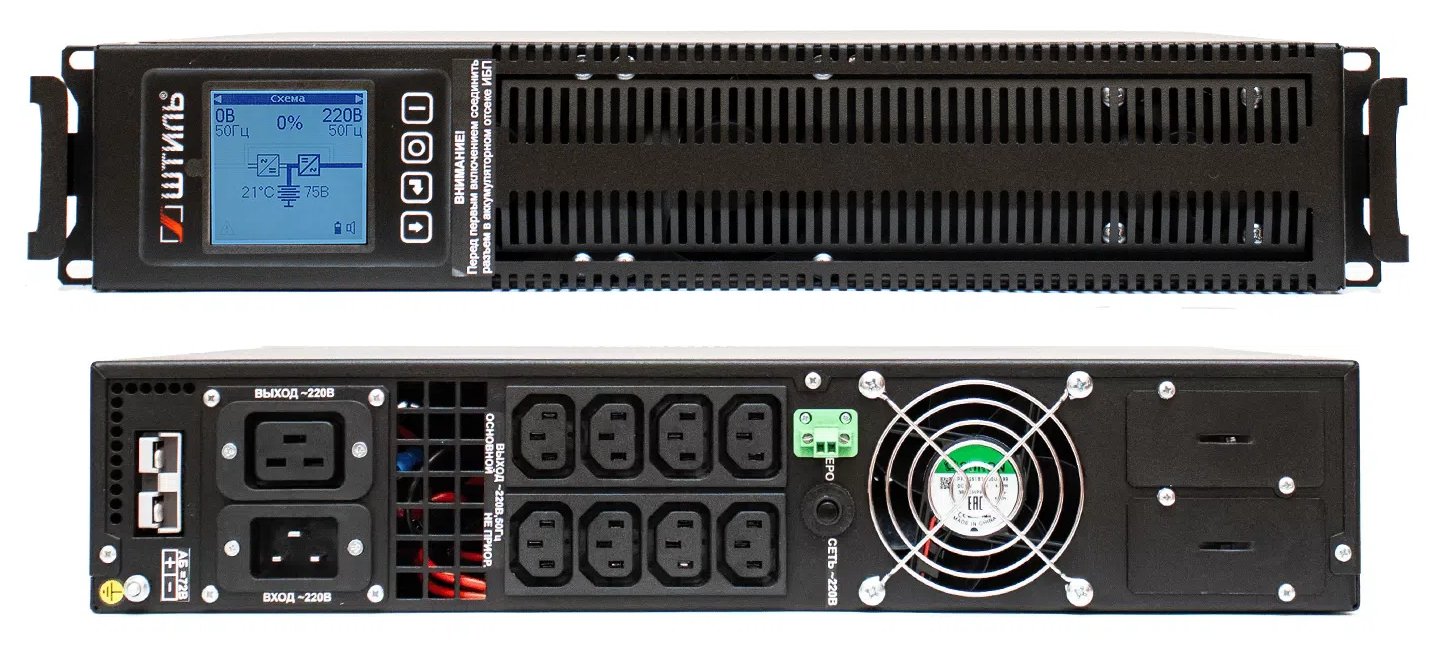Источник бесперебойного питания. Источник бесперебойного питания в стойку, on-line (с двойным преобразованием), чистая синусоида, 2000 ВA (1800 Вт); U-вх.220 В; под внешние аккумуляторы, U-акб.72 В, I-заряд.4 А; ЖК-дисплей; выходные разъёмы - IEC-320-C13 (8 шт.), IEC-320-C19 (1 шт.); холодный старт, совместим с генератором; высота 2U; IP20, t-раб.+5...+40°C, 88х482х447 мм
