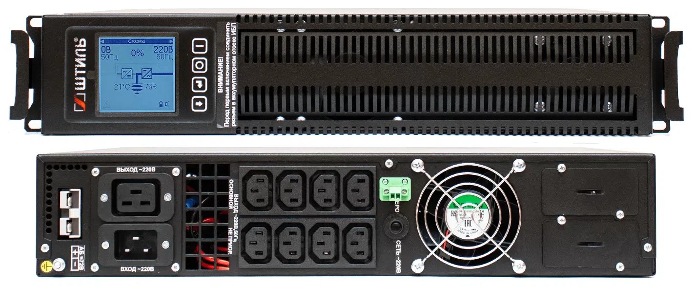Источник бесперебойного питания. Источник бесперебойного питания в стойку, on-line (с двойным преобразованием), чистая синусоида, 3000 ВA (2700 Вт); U-вх.220 В; под внешние аккумуляторы, U-акб.72 В, I-заряд.4 А; ЖК-дисплей; выходные разъёмы - IEC-320-C13 (8 шт.), IEC-320-C19 (1 шт.); холодный старт, совместим с генератором; высота 2U; IP20, t-раб.+5...+40°C, 88х482х447 мм