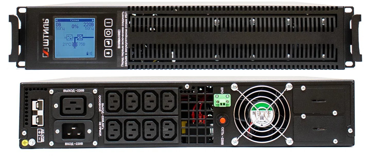 Источник бесперебойного питания. Источник бесперебойного питания в стойку, on-line (с двойным преобразованием), чистая синусоида, 3000 ВA (2700 Вт); U-вх.220 В; U-акб.72 В, I-заряд.1 А, 6 батарей 12 В 9 А·ч; ЖК-дисплей; выходные разъёмы - IEC-320-C13 (8 шт.), IEC-320-C19 (1 шт.); холодный старт, совместим с генератором; высота 2U; IP20, t-раб.+5...+40°C, 88х482х595 мм