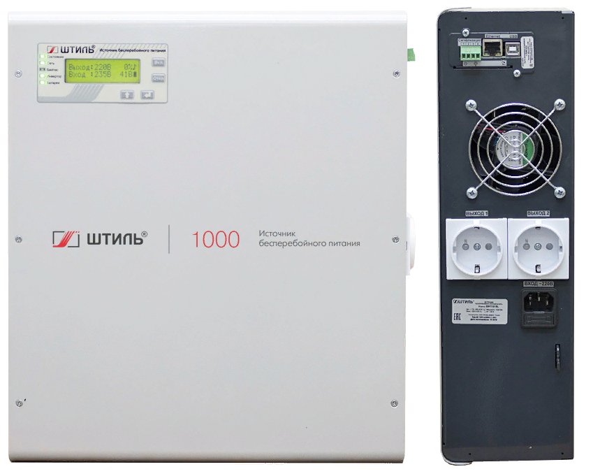 Источник бесперебойного питания. Источник бесперебойного питания настенный, on-line (с двойным преобразованием), чистая синусоида, 1000 ВA (900 Вт); U-вх.220 В; встроенные аккумуляторы, 3х12В/9Ач, U-акб.24 В, I-заряд.1 А; ЖК-дисплей; выходные разъёмы - EURO F-type с заземлением (2 шт.); холодный старт, совместим с генератором; IP20, t-раб.+5...+40°C, 379х357х116 мм (с кронштейном)
