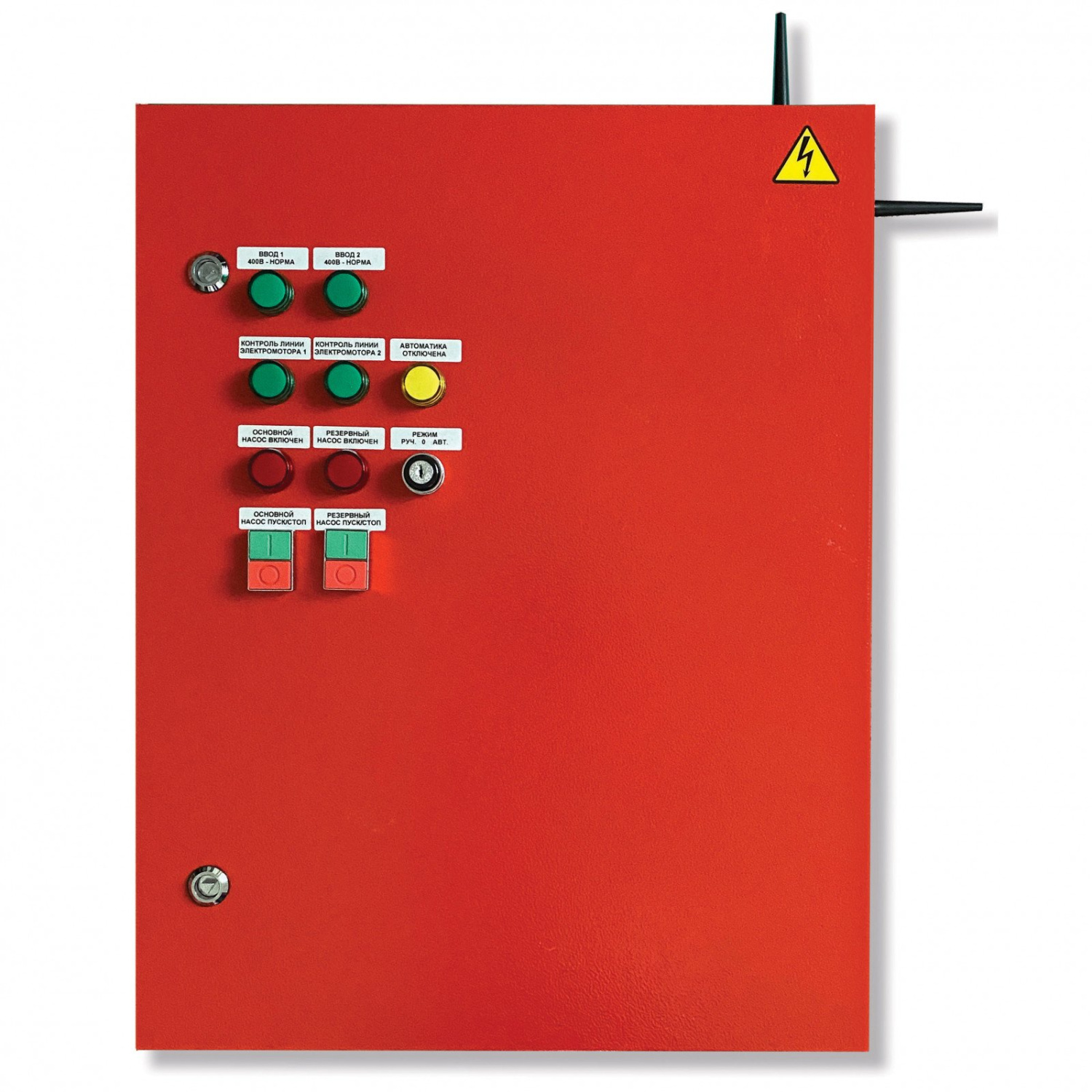 Шкаф управления двумя пожарными насосами. Шкаф управления электромоторами пожарных насосов систем внутреннего противопожарного водопровода радиоканальный для работы в составе радиосистемы Стрелец-ПРО, встроенный ретранслятор; f-раб.868 МГц, дальность связи до 2000 м (с радиорасширителями), U-пит.400 В, P-двиг.5.5 кВт, IP54, t-раб.-10…+50°С, 500х400х220 мм