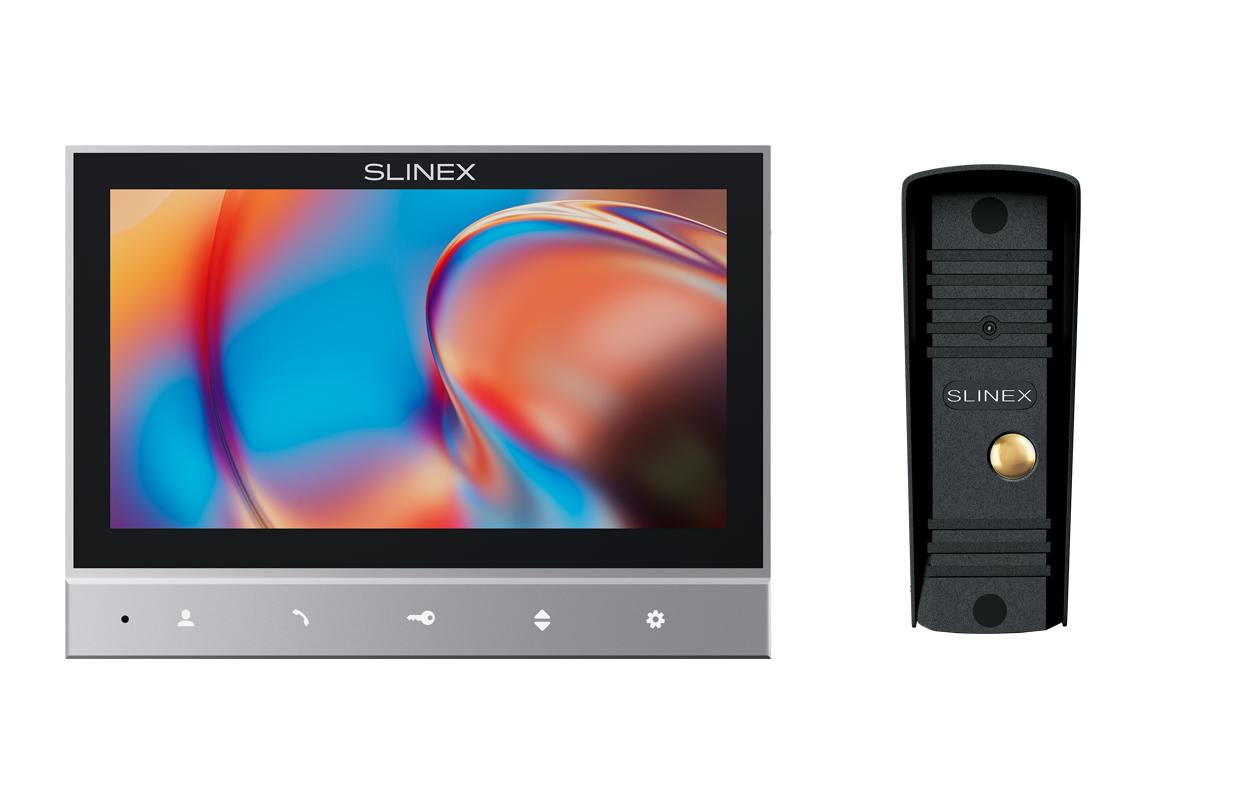 Комплект вызывной панели с монитором. Монитор SK‑07: Цветной настенный видеомонитор с 7″ TFT LCD экраном формата 16:9, разрешение 1024х600. Сенсорные кнопки. Формат - CVBS (PAL или NTSC). Поддержка 1-й вызывной панели. Питание: ~100-240 В или +13,5 В, 6 Вт, 176х129х23 мм. Цвет: серебро+черный.