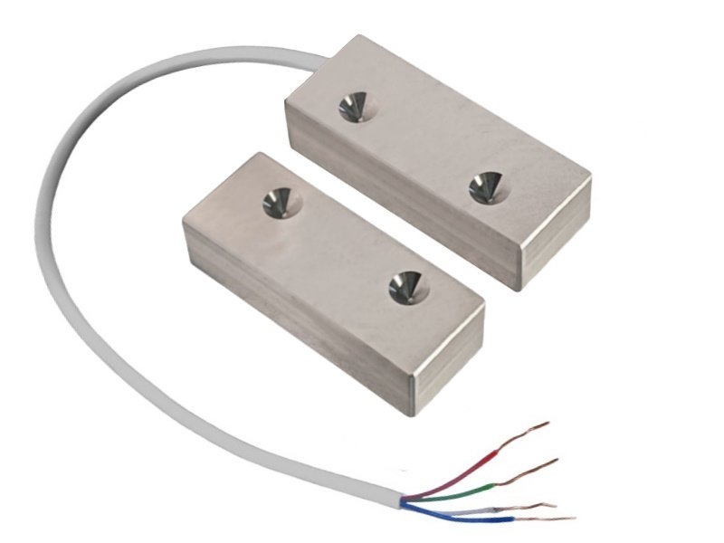 Датчик положения магнитогерконовый. Датчик положения магнитогерконовый; контакты размыкаются при тревоге, 8 мм (контакты замкнуты), 20 мм (контакты разомкнуты); U-коммут. 72 В, I-коммут. 500 мА, P-коммут. 10 Вт; IP66, t-раб.-50…+50°C, 40х15х10 мм (геркон), 40х15х10 мм (магнит). Отдельная антисаботажная цепь. Длина выводов 180 мм. Алюминиевый корпус.