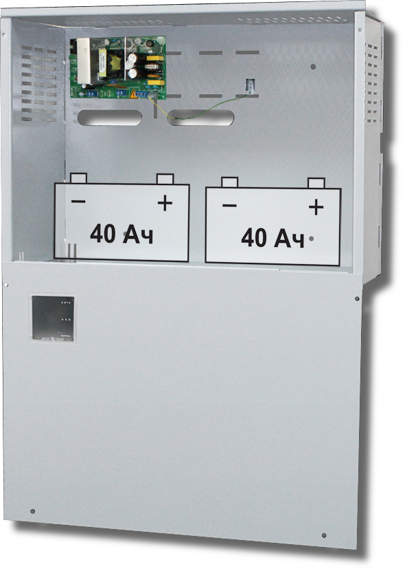 Источник вторичного электропитания резервированный. Резервированный источник питания; U-вх.150…250 В, U-вых.12.9…14 В, I-ном.4 А, I-max.5 А (до 5 сек); под один или два аккумулятора 12 В 40 А·ч; световая индикация режимов работы, диагностические выходы "открытый коллектор", защита от короткого замыкания, защита аккумулятора от глубокого разряда; t-раб.-10…+40°С, 445х328х193 мм