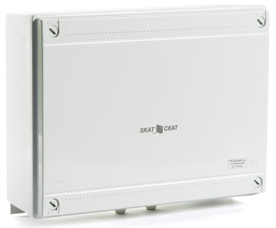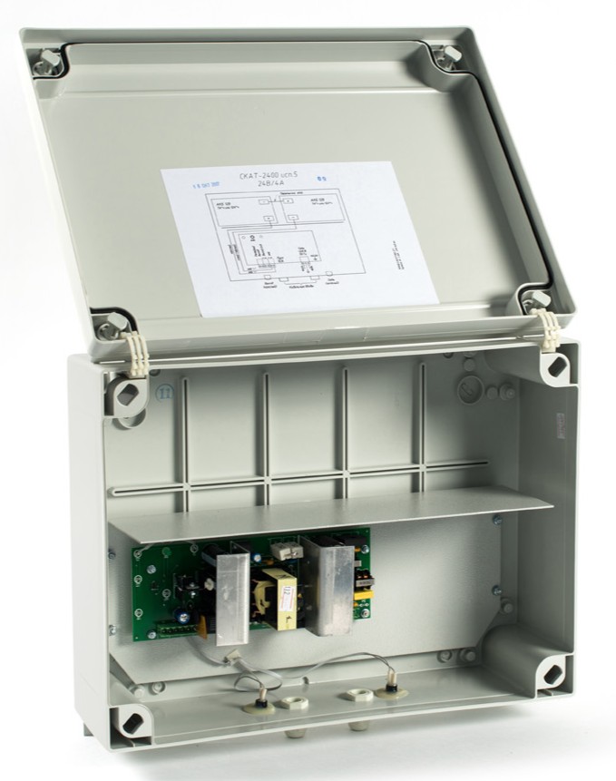 Источник вторичного электропитания резервированный. Резервированный источник питания уличный; U-вх.187…242 В, U-вых.27…28 В, I-ном.4 А, I-max.4.5 А; под АКБ 12 В 7 А·ч или 12 В 12 А·ч; световая индикация режимов работы, защита от короткого замыкания, защита аккумулятора от глубокого разряда, IP56, t-раб.-40…+50°С, 418х335х140 мм
