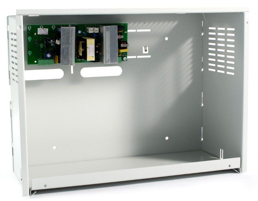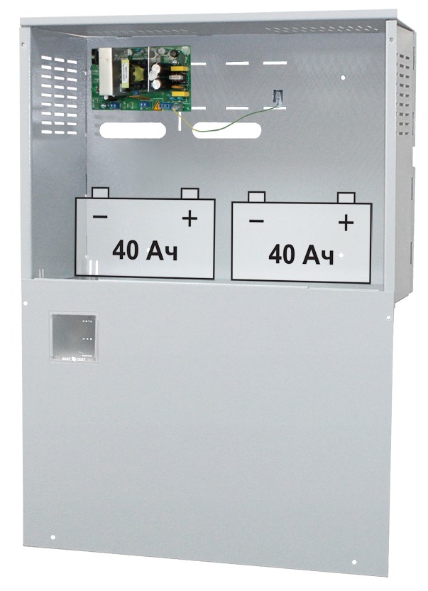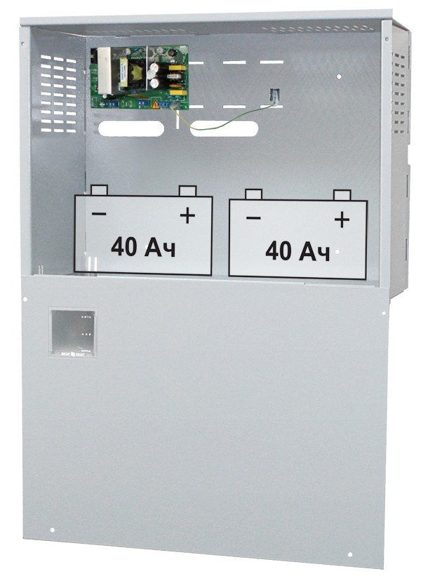 Источник вторичного электропитания резервированный. Резервированный источник питания; U-вх.185…242 В, U-вых.27…27.8 В, I-ном.4 А, I-max.4.5 А (до 5 сек); под два АКБ 12 В 40 А·ч; световая индикация режимов работы, диагностический выход типа "сухой контакт", защита от короткого замыкания, защита аккумулятора от глубокого разряда; t-раб.-10…+40°С, 445х328х193 мм