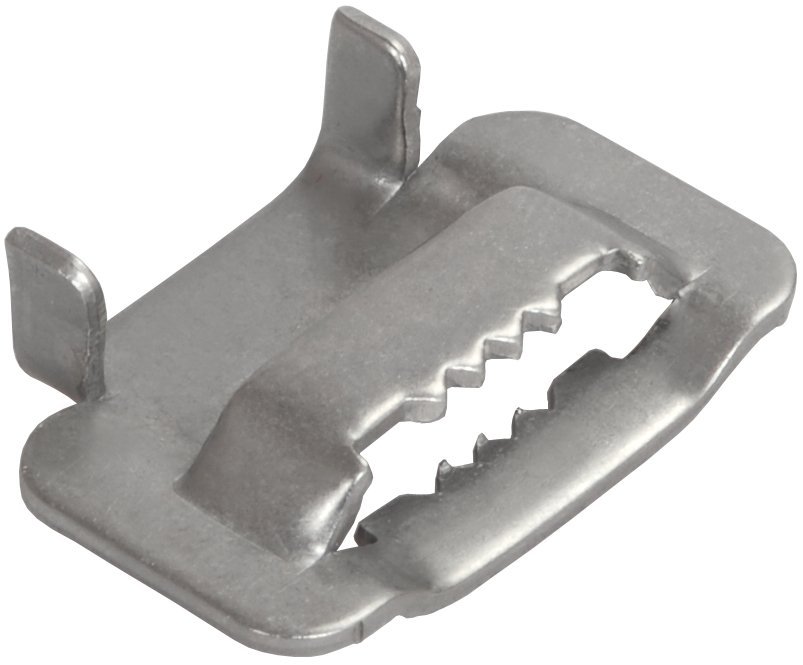 Скрепа для крепления бандажной ленты. Скрепа для крепления бандажной ленты ЛМ-50; толщина металла 1.5 мм, разрушающая нагрузка 17 кН, напряжение: 1000 В, t-раб. -60...+80 °C, габ.размеры 26х12х43 мм, сталь