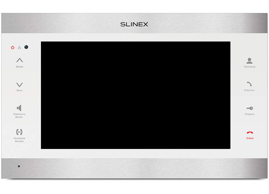 Монитор домофона цветной с функцией «свободные руки». Цветной, настенный, 10" сенсорный IPS TFT, 16:9, 1024х600, AHD-H/TVI/CVI/CVBS. Подключение 2-х панелей и 2-х камер. квадратор, функция DVR (запись по всем четырем каналом по детекции движения или по расписанию), Поддержка IP камер. Ethernet, Wi-Fi. Запись фото или видео на microSD, до 256 ГБ. Интерком до 4-х домофонов: SL-10M(HD), Sonik 10, SL-07M(HD), SQ-07MT(HD), SM-07M(N/HD), Sonik 7, SQ-04M; SL-07IP(HD) и SL-10IPT(HD), а также SM-07N/SL-07N/SL-10N/Sonik 7 Cloud могут быть только основными при соединении в интеркоме. MP3 мелодии вызова, три временных режима уровня громкости, режим «Не беспокоить». Переадресация вызова на приложение Slinex Smart Call, удаленный просмотр дополнительных камер и вызывных панелей. Дополнительная сменная лицевая панели в комплекте. 12 Вт, ~100-240 В или +13,5 В, 305×190×24 мм. Цветовые решения: серебро+белый.