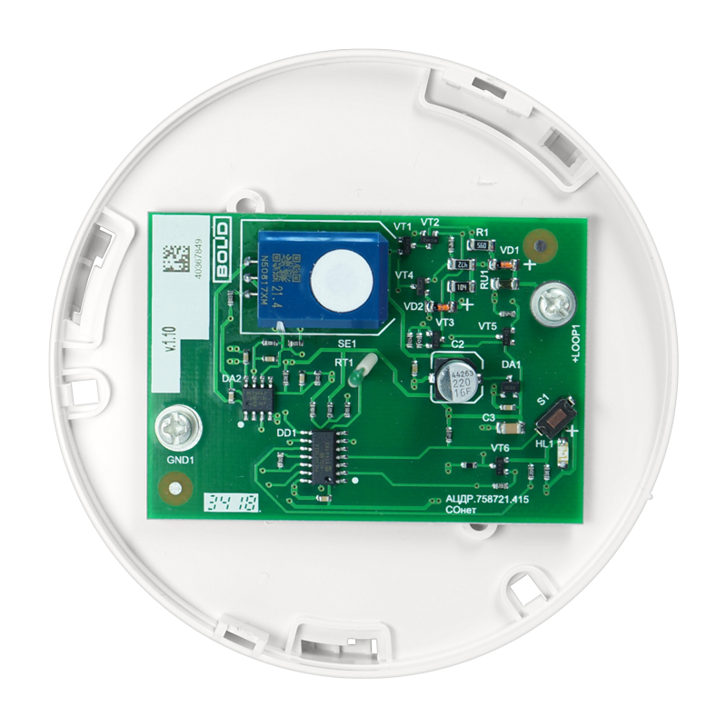 Извещатель пожарный комбинированный газовый пороговый и тепловой максимально-дифференциальный. Извещатель пожарный газовый (угарный газ) и тепловой максимально-дифференциальный (AR1), двухпроводный, t-сраб.+54°C, U-пит.9…30 В, I-потр.100 мкА, IP41, t-раб.-30...+55°C, 100х47 мм
