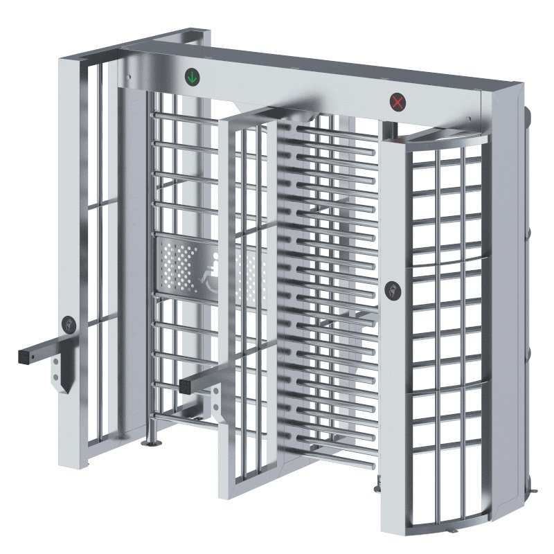Турникет электромеханический полноростовый. Турникет полноростовой роторный СТ 4М серия СПЕКТР Z, ширина прохода 1000+600мм, встроенные считыватели Mifare, всепогодное исполнение, "сухие контакты на плате управления", пропускная способность 25-35 чел/мин, 100-240 В, 50 Гц, IP54, -15 - +55°C. ПДУ комплекте. Материал корпуса - нержавеющая сталь AISI 304, габариты прохода 2100х600 мм, часть с калиткой 2100х1000 мм, внешние габариты 2520х1304х2334 мм.