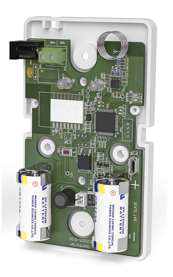 Сирена радиоканальная. Оповещатель светозвуковой радиоканальный для работы с панелями Mega v.5, Mega v.8, Mega Fire (Пожарный); f-раб. 868,7…869,2 МГц, Р-изл. ≤25 мВт; уровень звукового давления 95дБ; тампер, microUSB; U-пит. 12±2 В, резервный источник питания CR123A, I-потр. ≤36 мА; t-раб.-30...+50°C; габ.размеры 123х73х49.5 мм. В комплекте с блоком питания 14 В