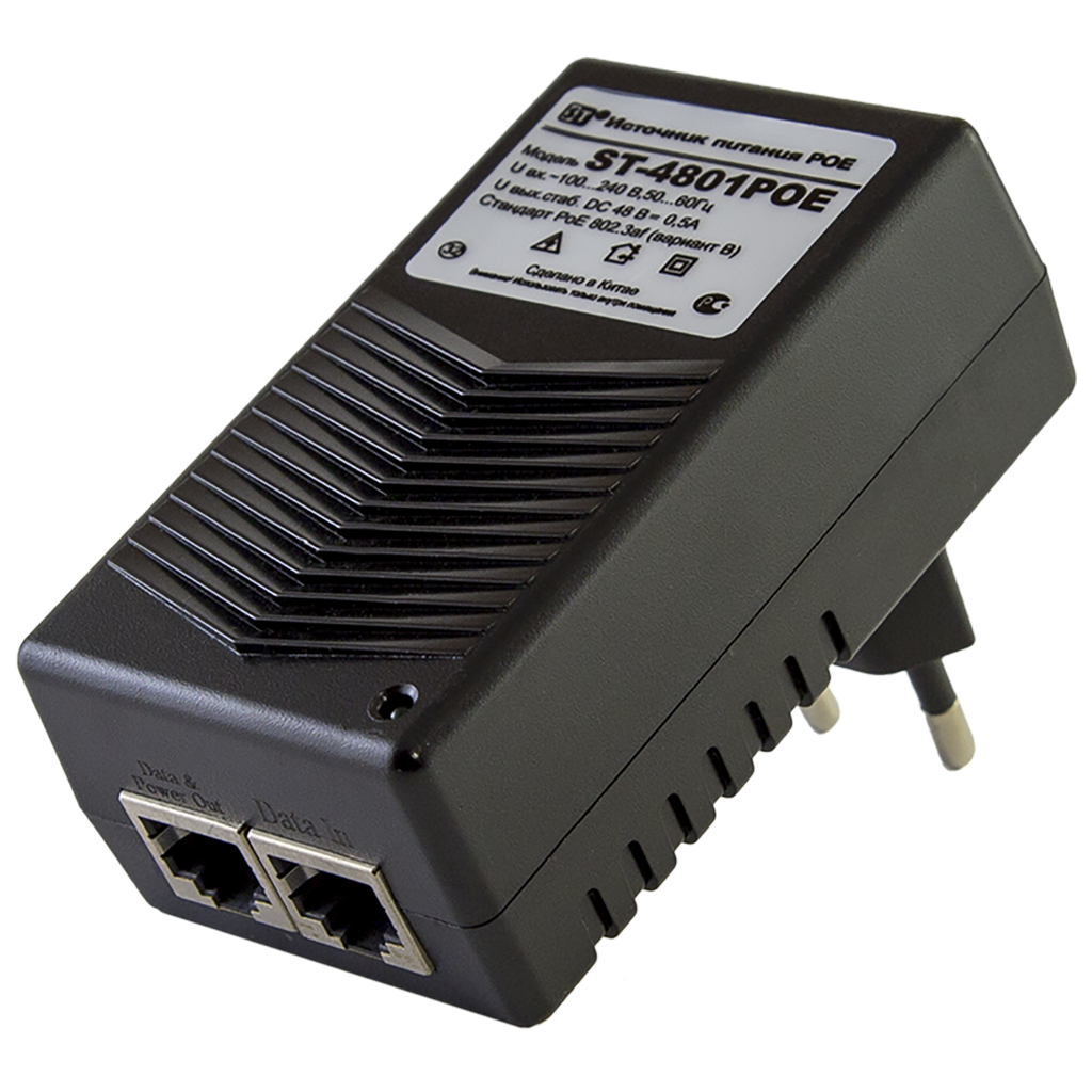 Инжектор PoE. Инжектор PoE однопортовый, 48В, 24 Вт, защита от КЗ, 2хRJ45, IEEE 802.3at(вар.B), -10...+40°C, 83х47х68 мм.