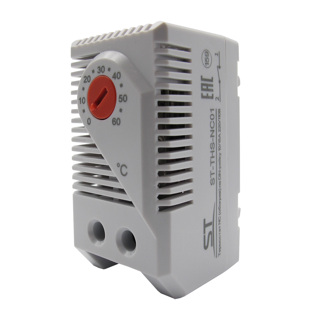 Термостат. Термостат механический на DIN-рейку, нормально-замкнутый NC - для включения обогревателя, диапазон регулировки t-включения 0…+60°C, I-коммут. 10 А, U-номин. 110/230 В, IP20, -20°C...+80°C, 60х33х43 мм.