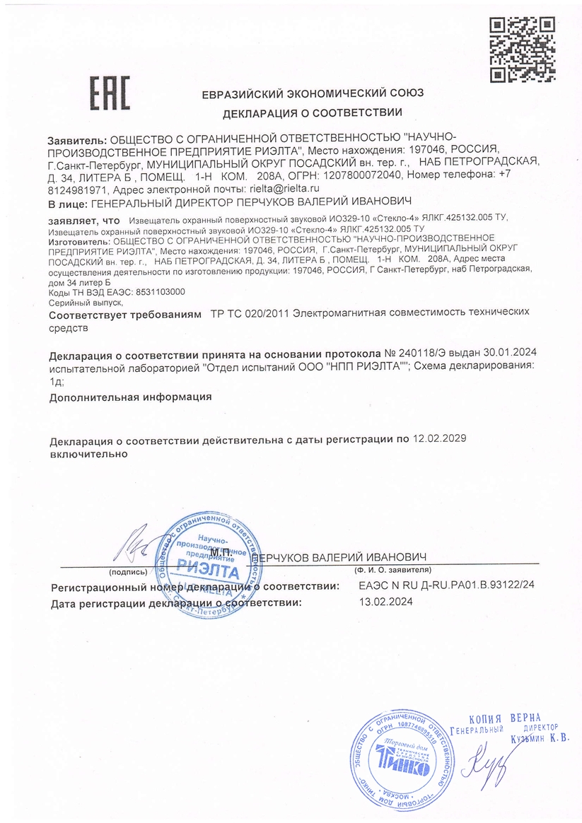 Извещатель охранный «Стекло-4» предназначен для обнаружения разрушения всех известных видов строительных стекол (обычных, закаленных, узорчатых, армированных, многослойных и защищенных полимерными пленками), однокамерных и двухкамерных стеклопакетов и выдачи извещения о тревоге на ППК (СПИ, ПЦН) размыканием шлейфа сигнализации (ШС) контактами исполнительного реле.