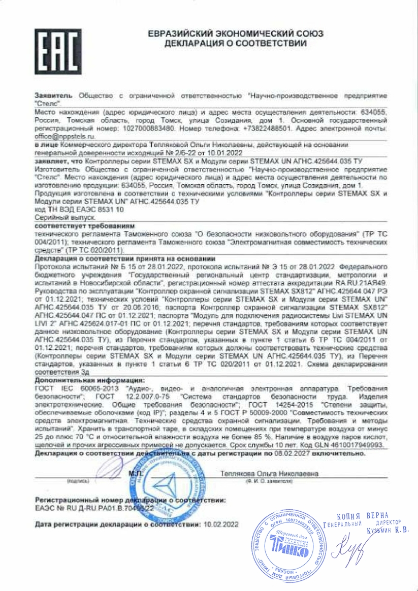 Модуль обеспечивает возможность передачи сообщений на станцию мониторинга STEMAX по сети Ethernet.Модуль позволяет установить проводное подключение контроллера к сети Интернет через локальную вычислительную сеть на объекте охраны. Обмен данными между контроллером и станцией мониторинга STEMAX осуществляется с использованием собственного стека протоколов TCP/IP. Безопасность передачи данных обеспечивается применением собственного протокола шифрования MSRV.