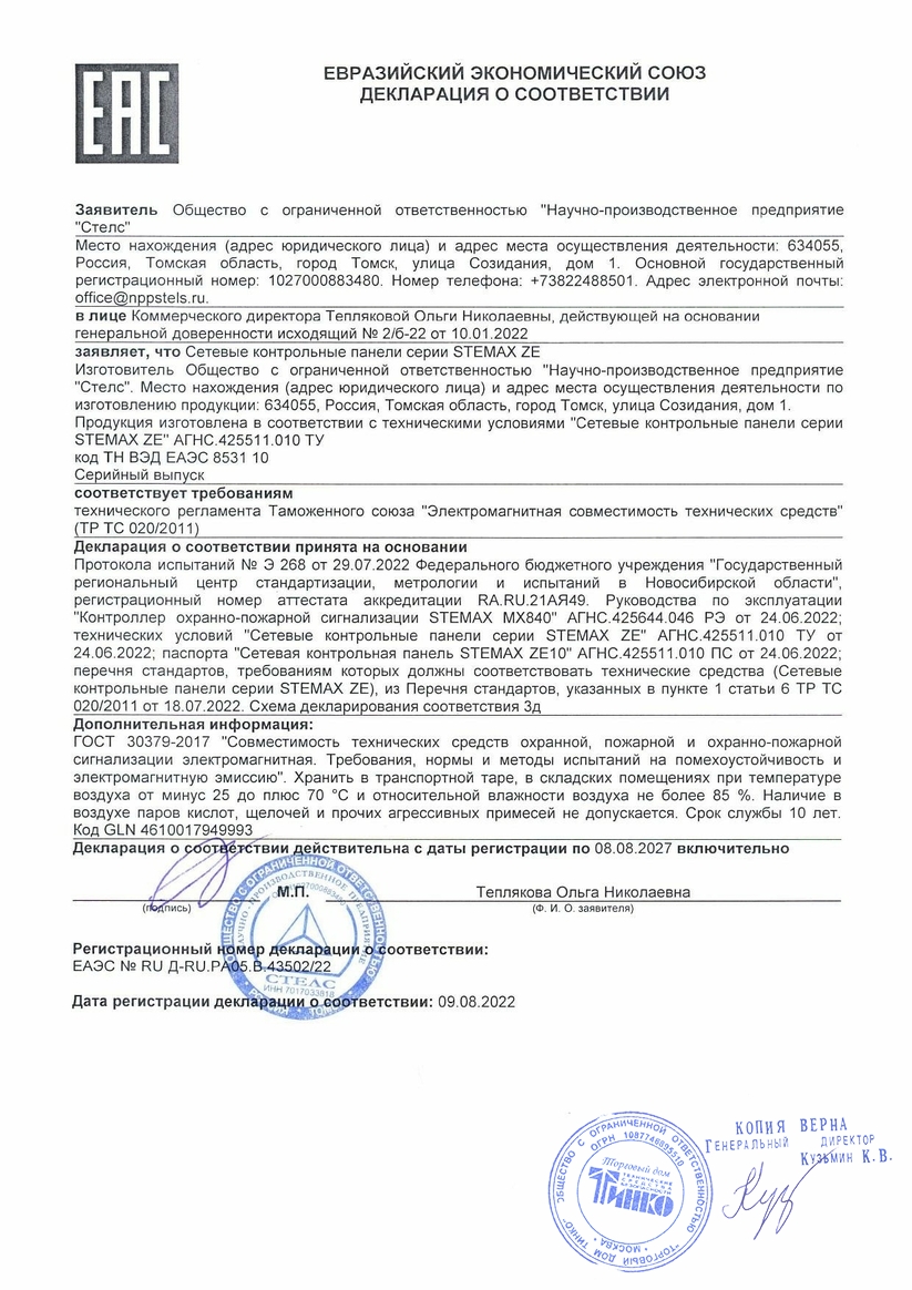 Контрольная панель сетевая. Сетевая контрольная панель, 10 охранных ШС, 3 выхода ОК, порт Touch Memory, RS-485, U-пит. 12 В, I-потр. 50 мА; IP30, t-раб. -40...+55°C, габ.размеры 210х118х44 мм. Работает с контроллерами STEMAX MX840, STEMAX MX810/820, Мираж-GSM-M8-04, Мираж-GSM-M8-03.
