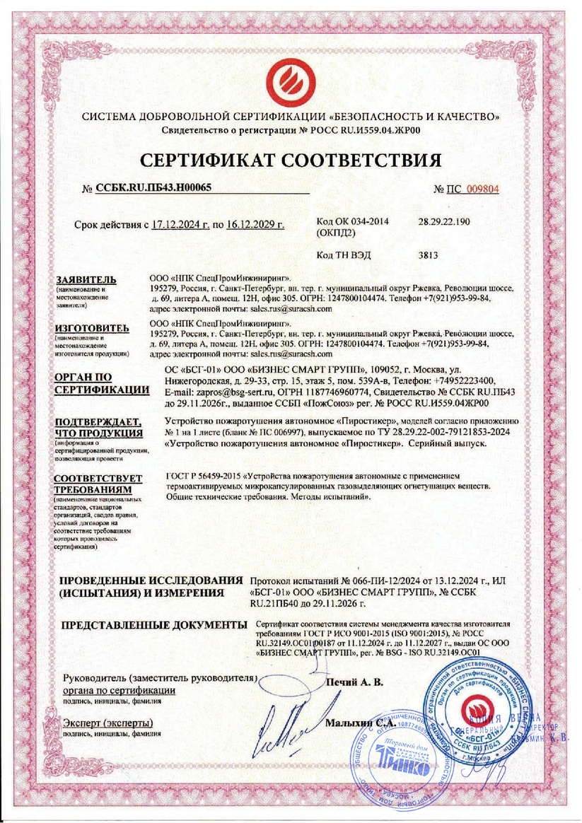 Автономная установка пожаротушения с ТЕРМА-ОТВ. Автономная установка пожаротушения пожаров класса A, B, C, E для установки в распределительные и шкафы управления; защищаемый объём до 65 литров. В комплекте два пиростикера 100х125 мм.