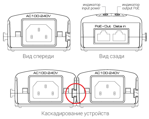 Инжектор PoE. Инжектор PoE IEEE 802.3af/at, гигабитный, расстояние передачи данных до 100 м; вход: AC 100-240 В, выход: DC 54 В, 30 Вт; 1xRJ-45 Data 10/100/1000 Мбит/с, 1xRJ-45 PoE 10/100/1000 Мбит/с IEEE 802.3af/at; защита выхода питания от КЗ и перегрузки, защита от электростатики, грозозащита; AC 110-240В, -10...+55°C, 64х60х160 мм.
