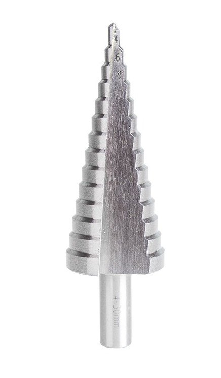 Сверло по металлу шлифованное. Сверло по металлу ступенчатое, быстрорежущая инструментальная сталь; шаг 2 мм, 14 ступеней; Ø ступеней: 4, 6, 8, 10, 12, 14, 16, 18, 20, 22, 24, 26, 28, 30 мм; цилиндрический хвостовик, прямая "канавка", блистер.
