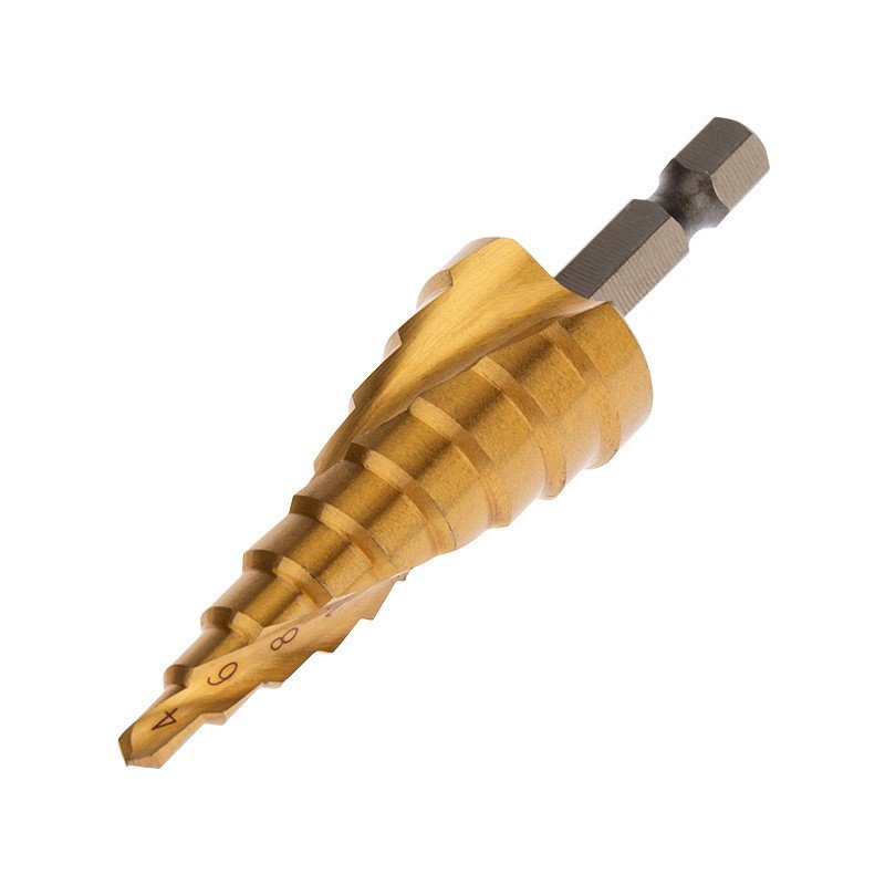 Сверло по металлу шлифованное. Сверло по металлу ступенчатое, быстрорежущая инструментальная сталь с покрытием из нитрид титана; шаг 2 мм, 9 ступеней; Ø ступеней: 4, 6, 8, 10, 12, 14, 16, 18, 20 мм; цилиндрический хвостовик, спиральная "канавка", блистер.