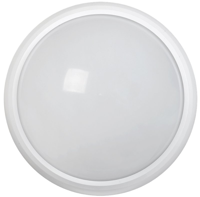 Светильник светодиодный с микроволновым датчиком движения. Светильник LED круглый, с микроволновым датчиком движения, мощность 8 Вт; световой поток 640 лм; цветовая температура 6500 K; U-вх. 200...240 В; IP65; t-раб.-40...+45°C; габ.размеры D178х80 мм, цвет белый