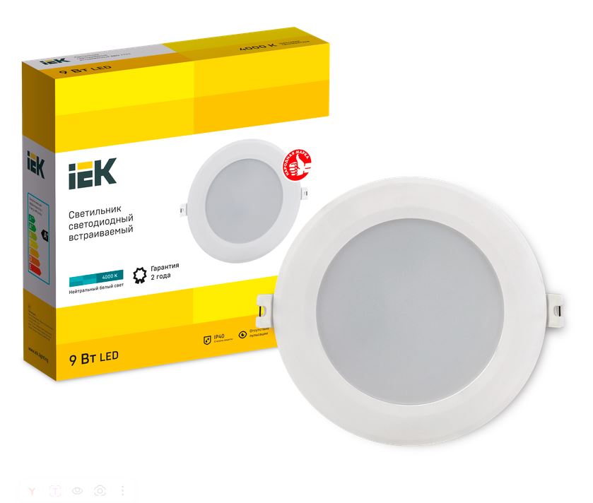 Светильник. Светильник светодиодный встраиваемый, 9 Вт, U-раб. 220 В, цвет.температура 4000К, свет.поток 750 лм, IP40, t-раб.0…+35°C, D145х31 мм. Пластиковый корпус. Цвет белый