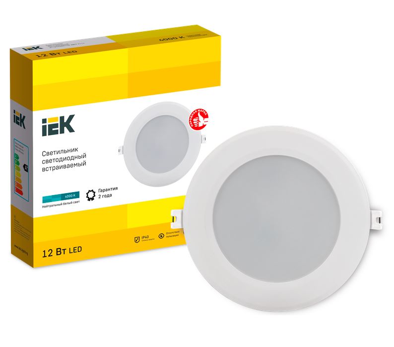 Светильник. Светильник светодиодный встраиваемый, 12 Вт, U-раб. 220 В, цвет.температура 4000К, свет.поток 1020 лм, IP40, t-раб.0…+35°C, D145х31 мм. Пластиковый корпус. Цвет белый