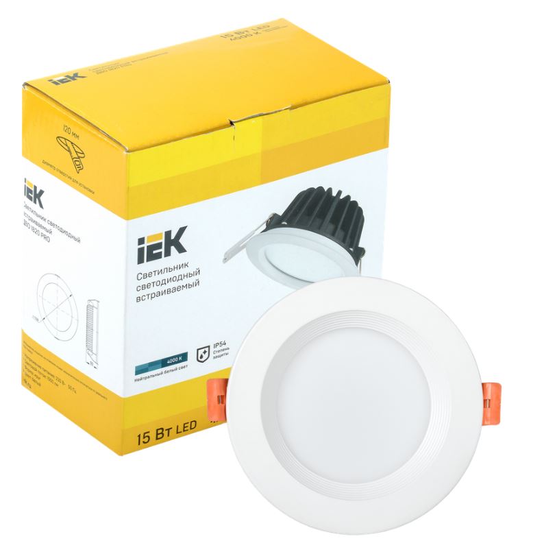 Светильник. Светильник светодиодный встраиваемый, 15 Вт, U-раб. 220 В, цвет.температура 4000К, свет.поток 1500 лм, IP54, t-раб.0…+35°C, D108х50 мм. Алюминиевый корпус. Цвет белый