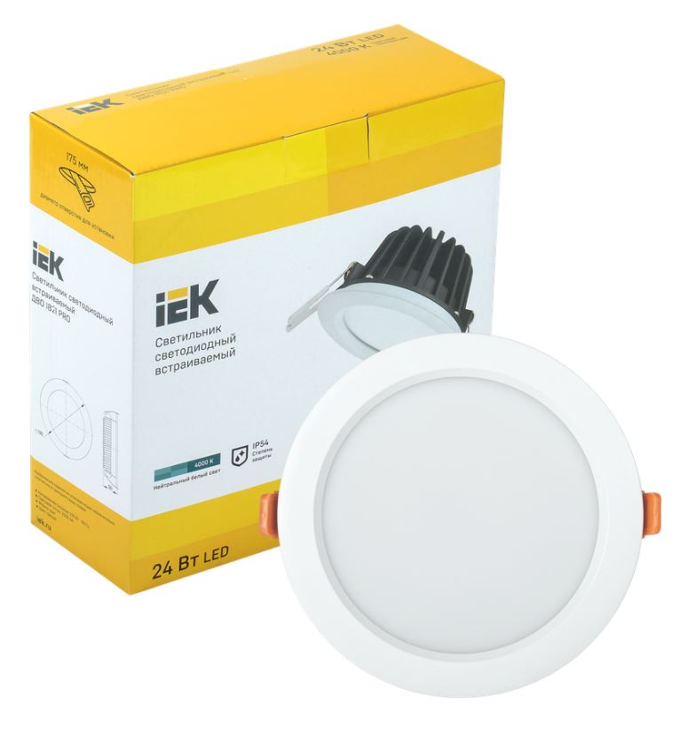 Светильник. Светильник светодиодный встраиваемый, 24 Вт, U-раб. 220 В, цвет.температура 4000К, свет.поток 2500 лм, IP54, t-раб.0…+35°C, D190х50 мм. Пластиковый корпус. Цвет белый