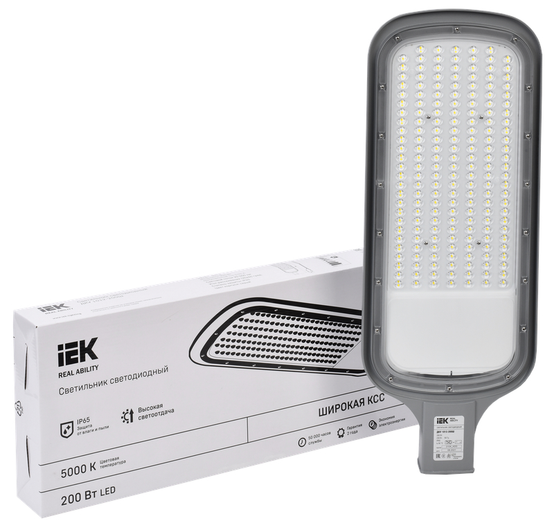 Светильник. Светильник светодиодный консольный, мощность 200 Вт, световой поток 20000 Лм, цветовая температура 5000 K, U-вх. 230 В; IP65, t-раб.-50...+50°C, 625х235х75 мм. Цвет серый.