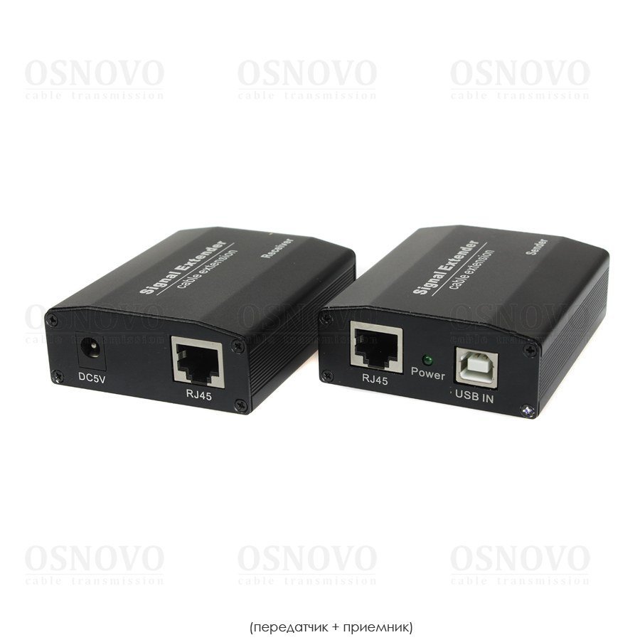 Удлинитель интерфейса. Удлинитель интерфейса USB 2.0 по кабелю витой пары (CAT5e/6) до 50м. Подключение устройств в режиме "Plug and Play". Приемник: Вх.-USB(A)x4/Роз.2,1х5,5мм(DC5В). Вых.-RJ45. Передатчик: Вх.-USB(B). Вых.-RJ45.В комплекте БП для приемника DC5В(1A)-1шт. Размеры передатчика и приемника (ШхВхГ): 64x25x79мм; Рабочая температура: 0...+55°C.