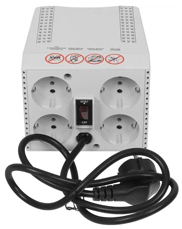 Стабилизатор напряжения. Стабилизатор напряжения; P-нагр. 1200 ВA/600Вт; U-вх.187…276 В; Розетки Schuko - 4 шт; защита от всплесков, перегрузки, КЗ; светодиодная индикация; t-раб.0…+40°C; 123х136х102 мм. Цвет серый.