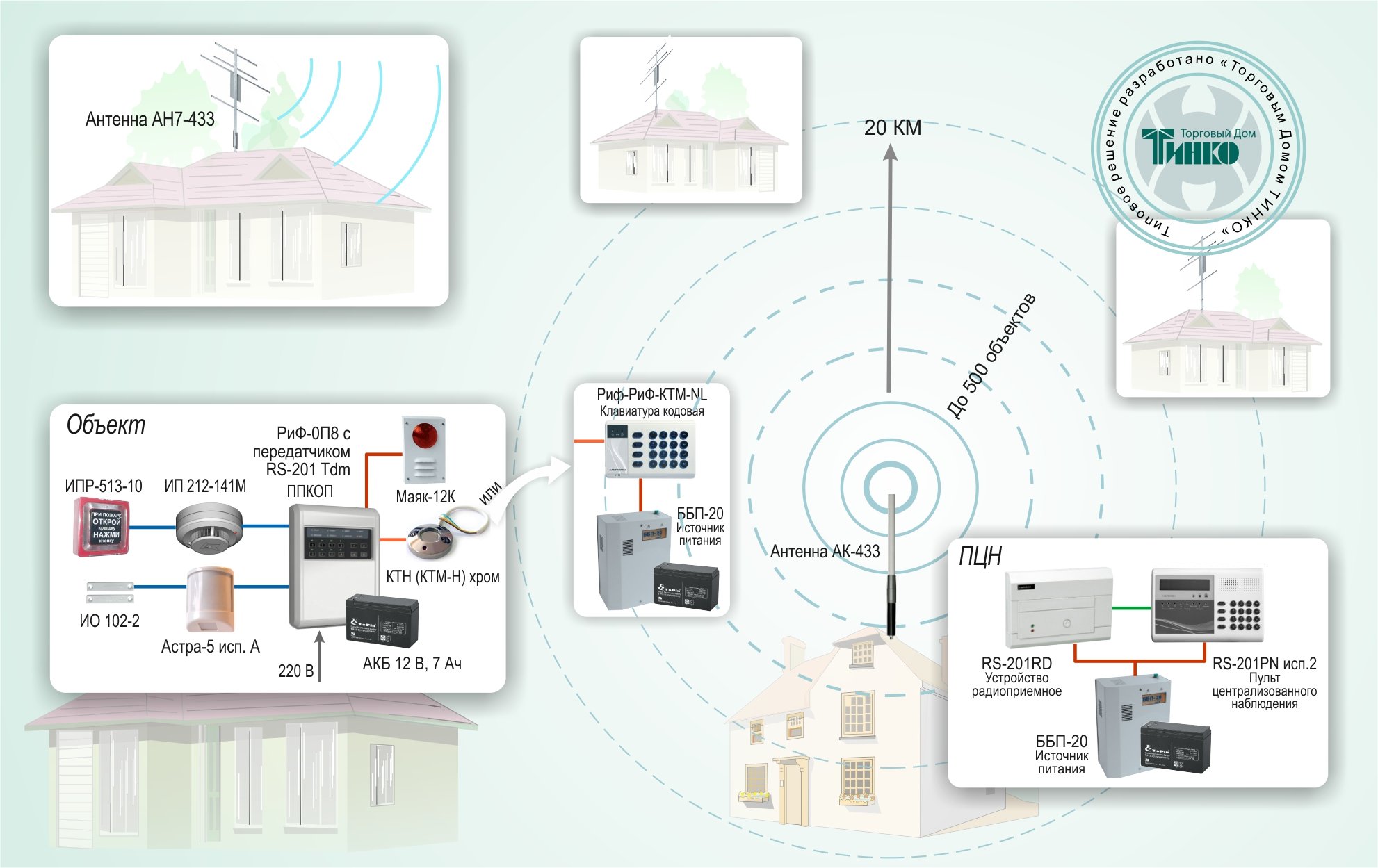 Схема построения радиоканальной системы охраны коттеджного поселка "РИФ СТРИНГ-201"