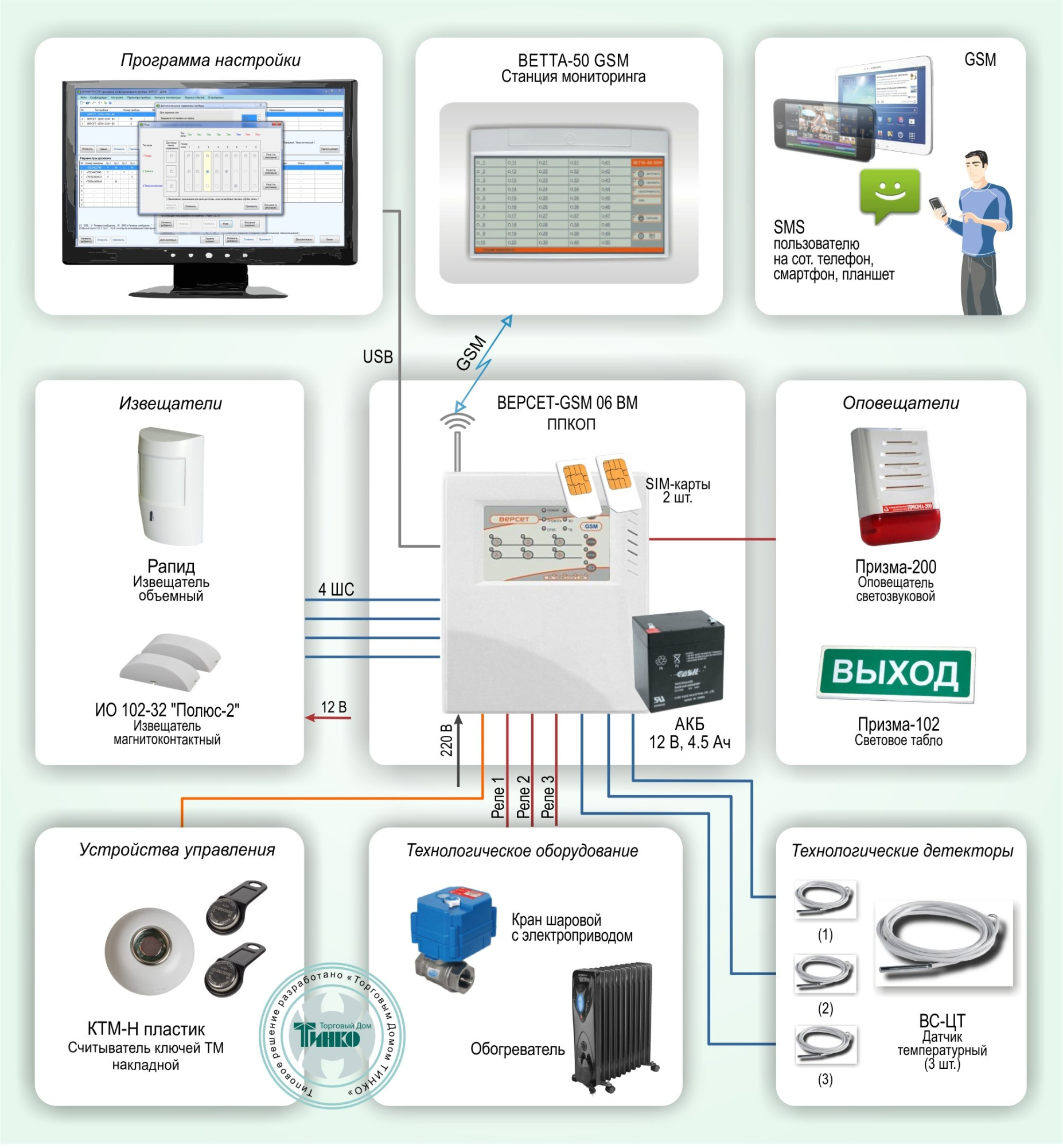 Схема построения системы на базе ППКОП "ВЕРСЕТ-GSM 06 ВМ"