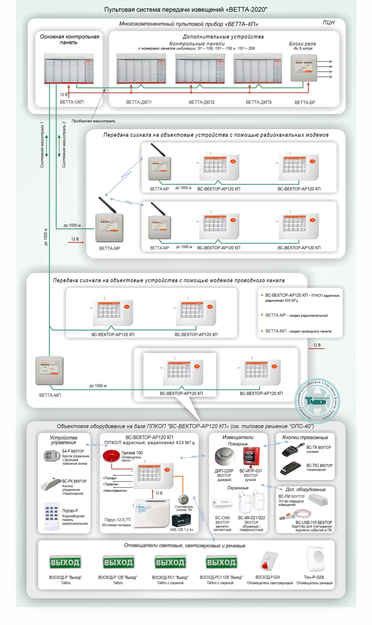 - В качестве объектовых приборов могут использоваться приборы приемно–контрольные охранно–пожарные адресные радиоканальные «ВС-ВЕКТОР-АР120 КП» со своими наборами адресных радиоканальных извещателей и оповещателей (см. типовое решение ОПС-40).
