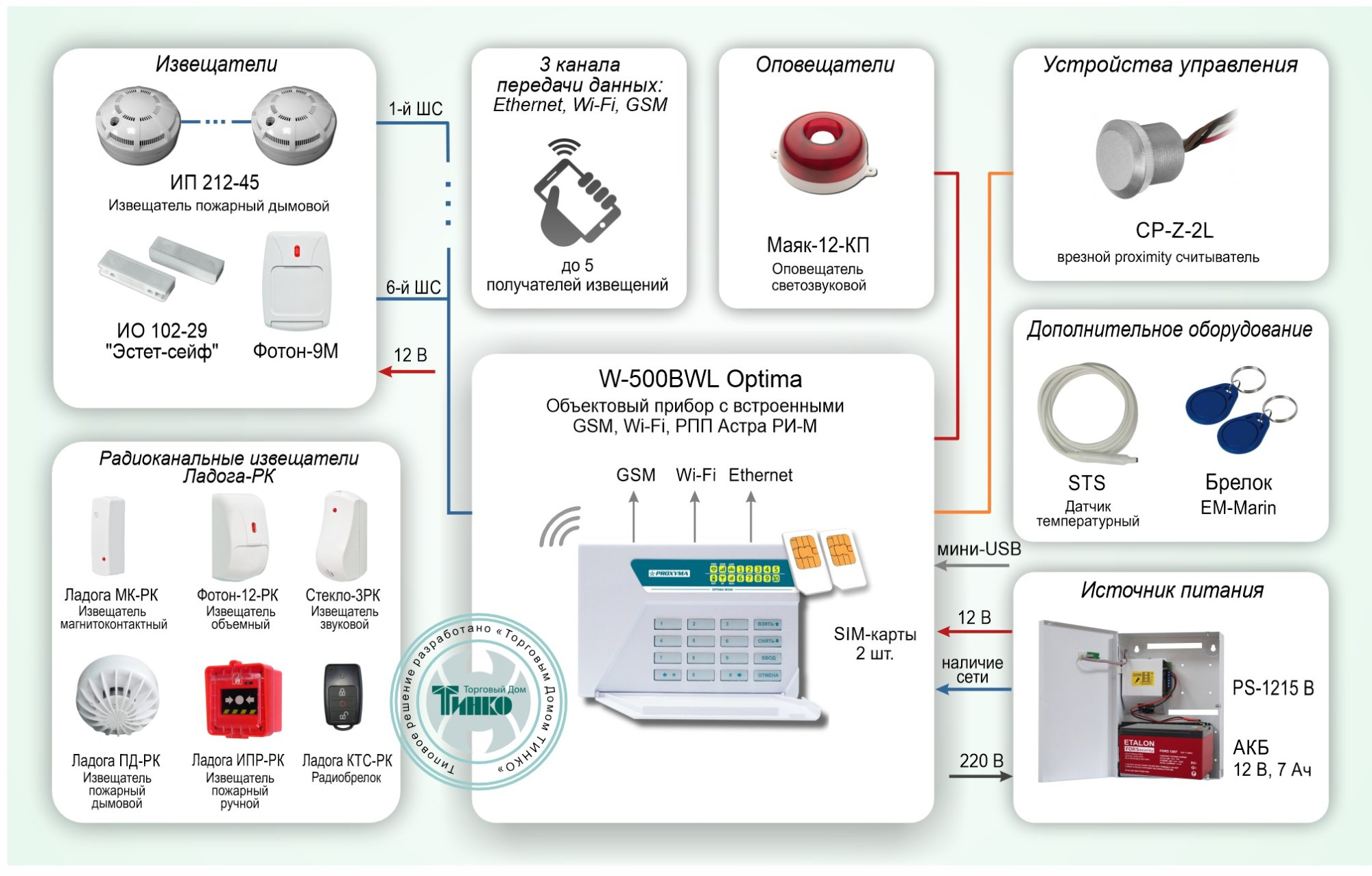 W-500BWL Optima имеет 5 шлейфов охранно-пожарной сигнализации, 3 выхода типа открытый коллектор. УОО имеет встроенное приемно-передающее радиоканальное устройство (РПП) «Ладога-РК» и поддерживает работу беспроводных адресных извещателей производства РИЭЛТА.