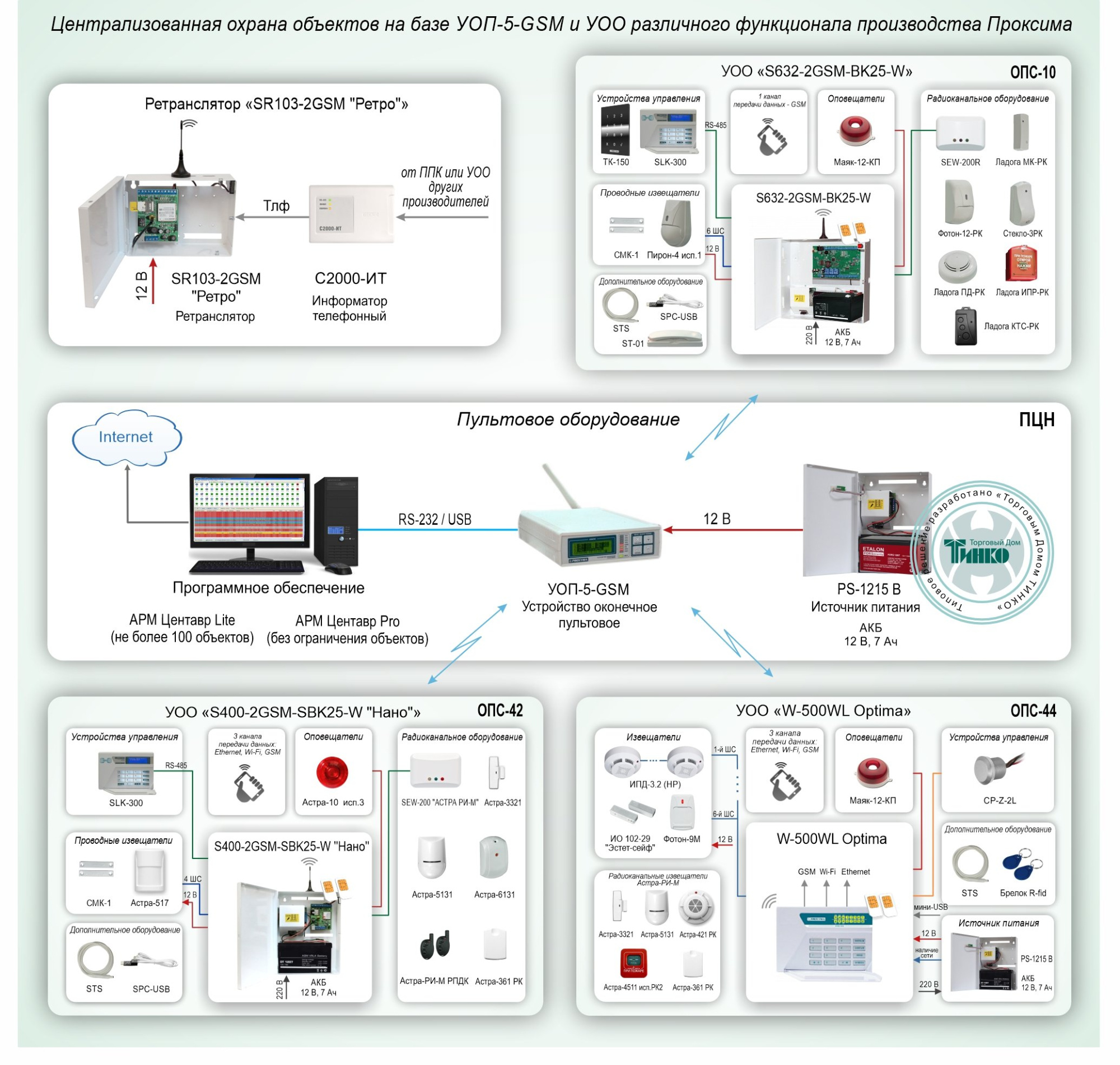 Схема построения системы централизованной охраны на базе УОП-5-GSM и УОО различного функционала