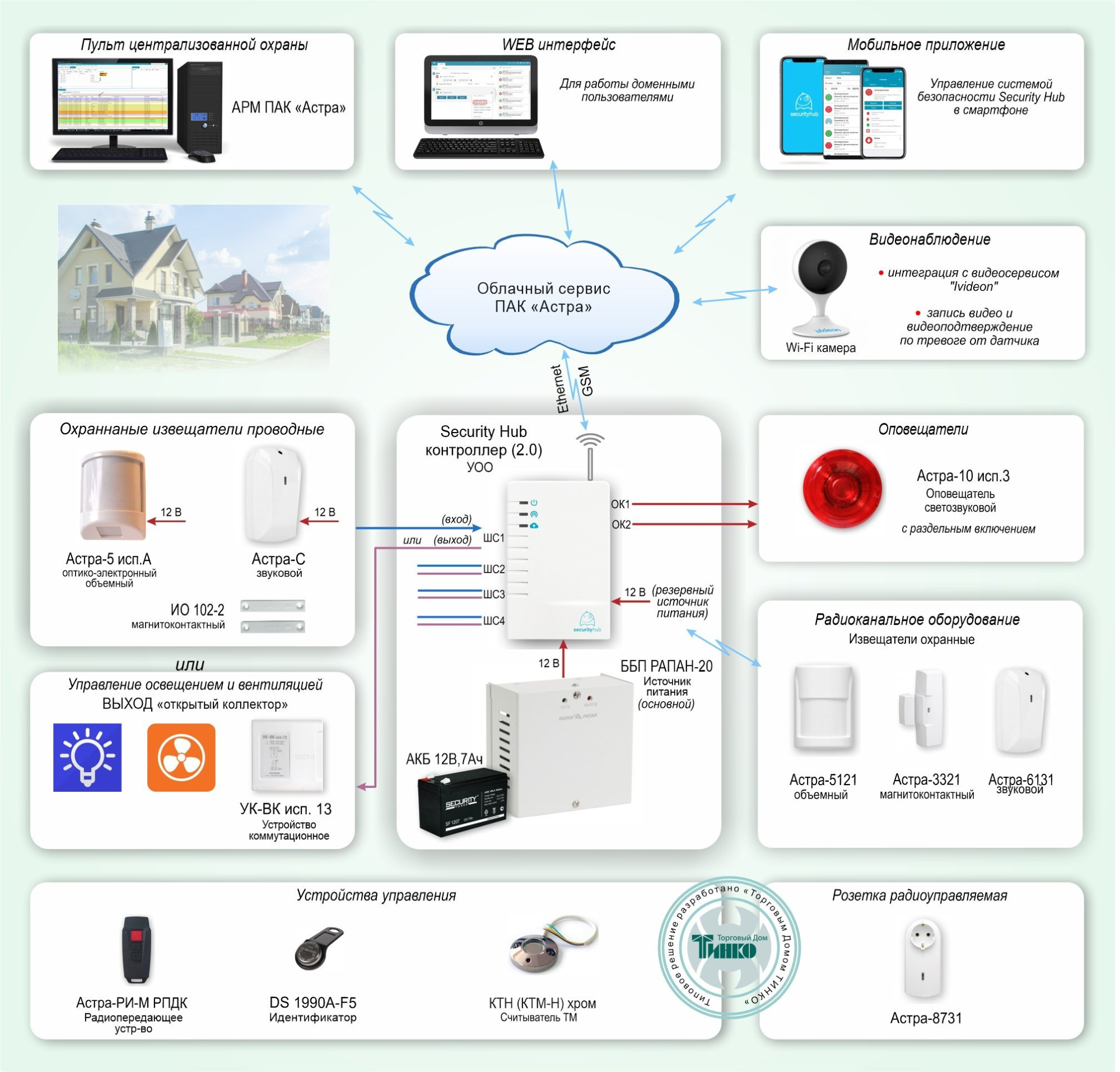 Схема GSM-сигнализации Security Hub для охраны квартир, загородных домов, офисов