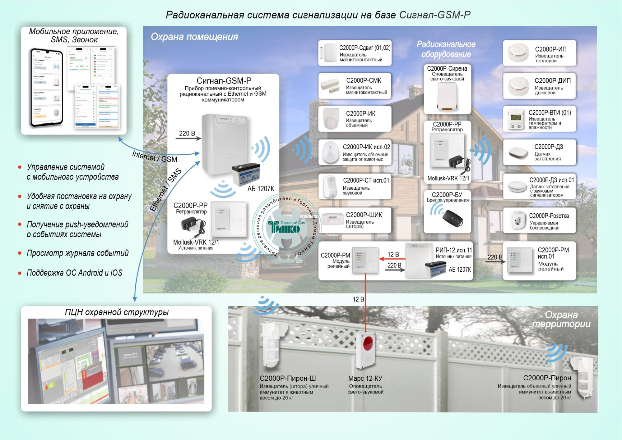 - в случае тревоги принимать сигналы от извещателей и передавать уведомления пользователям с помощью приложения для смартфона и на пульт централизованной охраны.