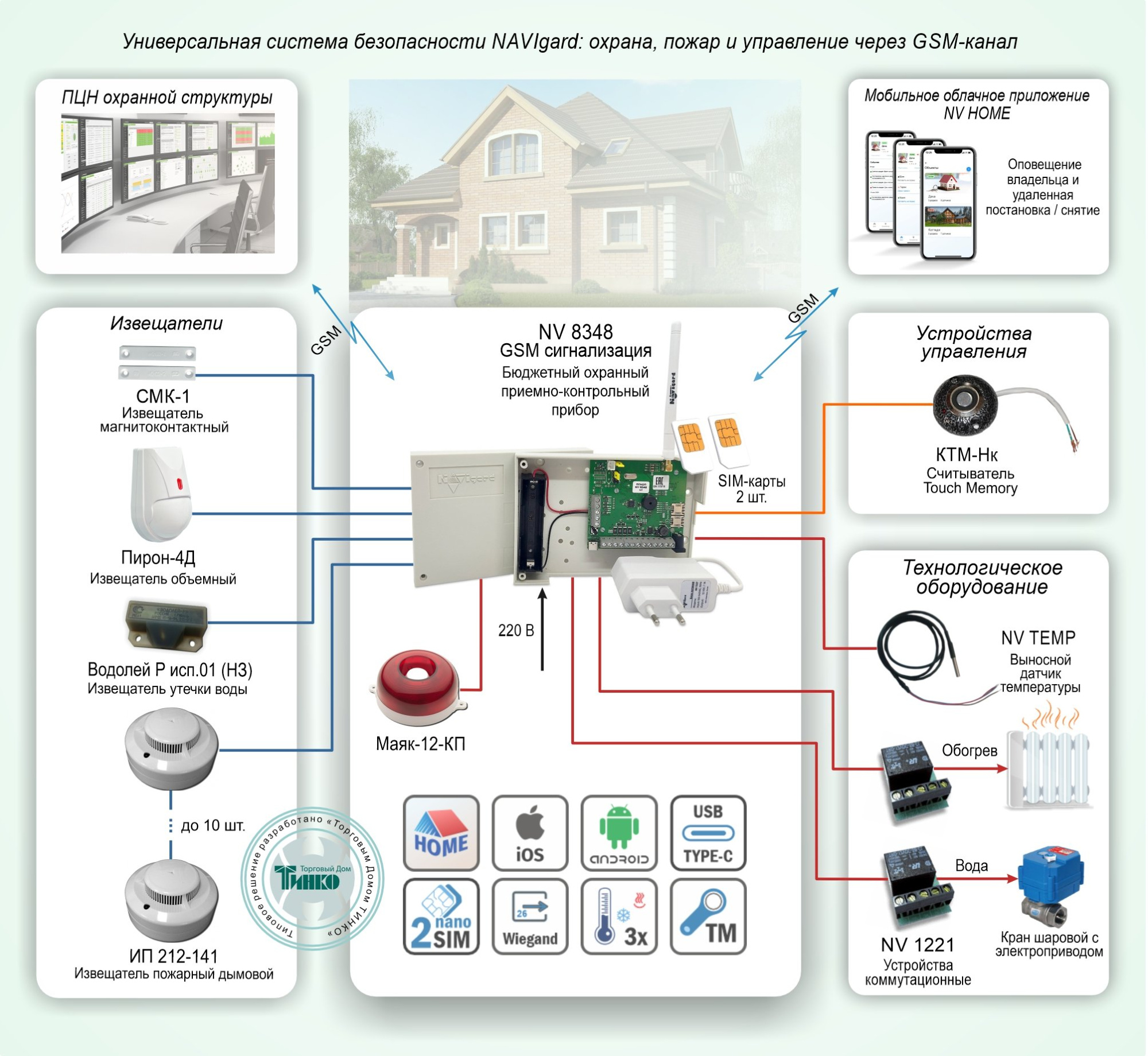 - система позволяет дистанционно управлять электроприборами, доступом (приводами ворот, замками) с сотового телефона по SMS, бесплатному звонку CLIP и приложением NV Home;