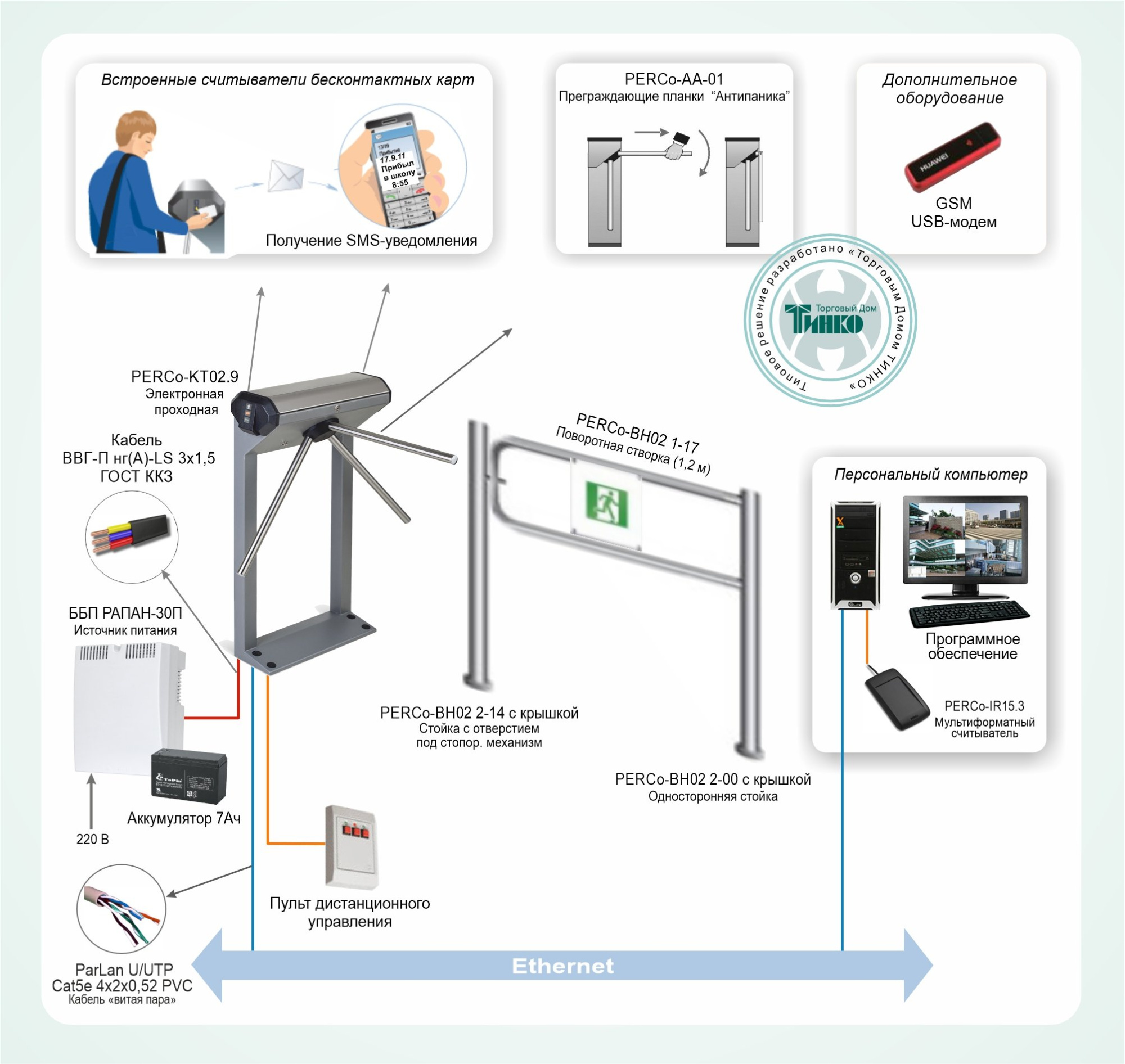 Предлагаемое типовое решение системы контроля доступа (СКД) реализовано на базе электронной проходной PERCo-KT02.9. СКД «Школа» — это готовое экономичное решение для организации контроля доступа в учебное заведение. Система не только предотвращает проникновение посторонних, но и с помощью SMS-сообщений уведомляет родителей о времени прихода ребенка в школу и ухода из нее.
